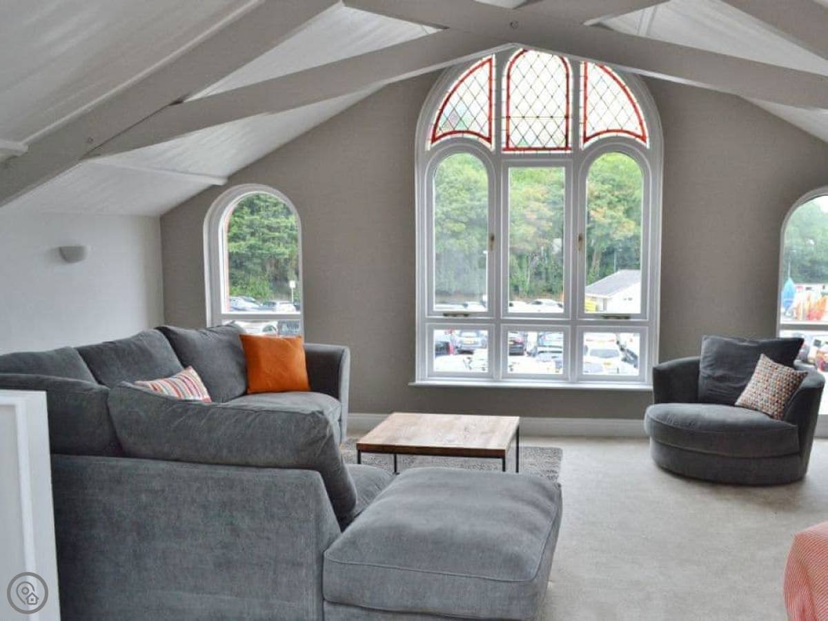 It's laid out upside down. The living room and kitchen are upstairs on the first floor. That's because of the big window. It's an arched window, floor to ceiling. You get a good view of the river from there. You can watch the Bodinnick ferry going back and forth.