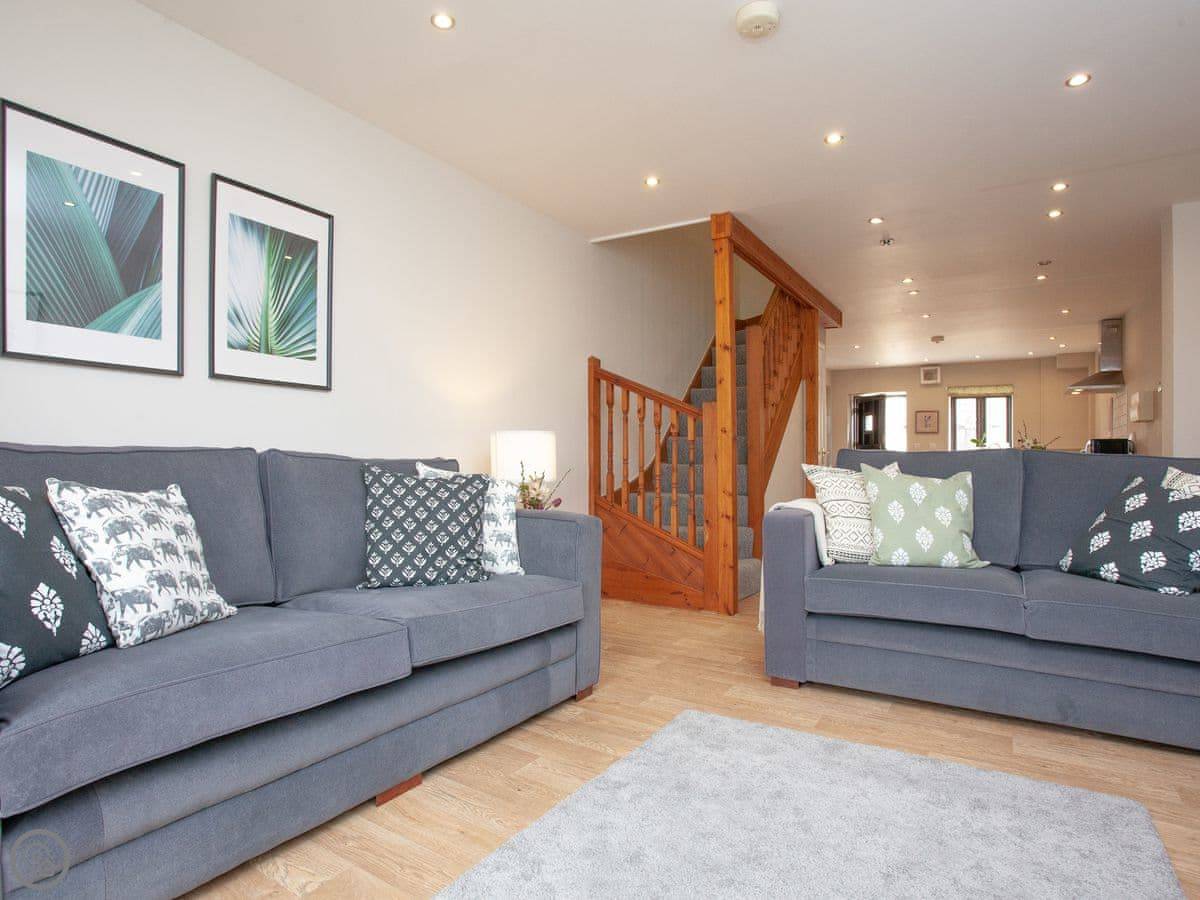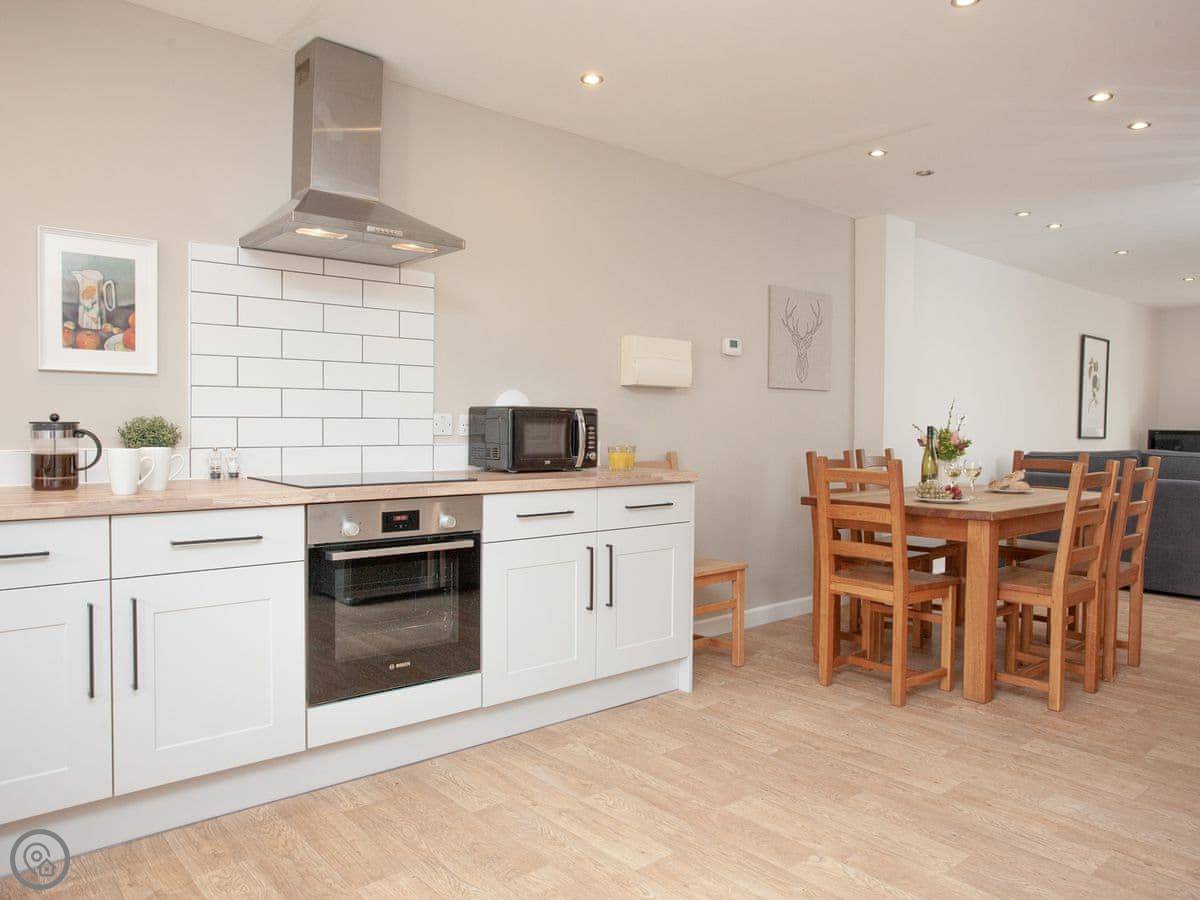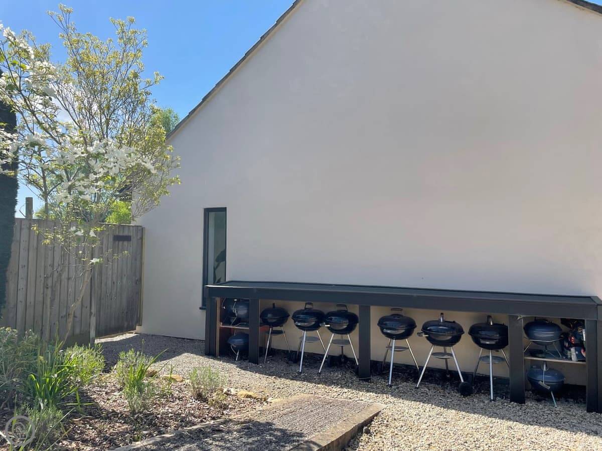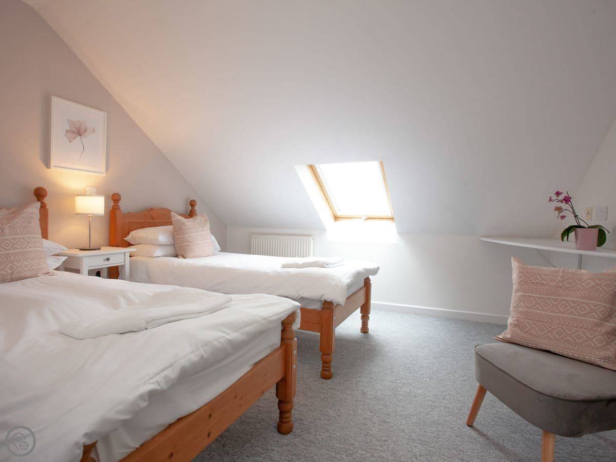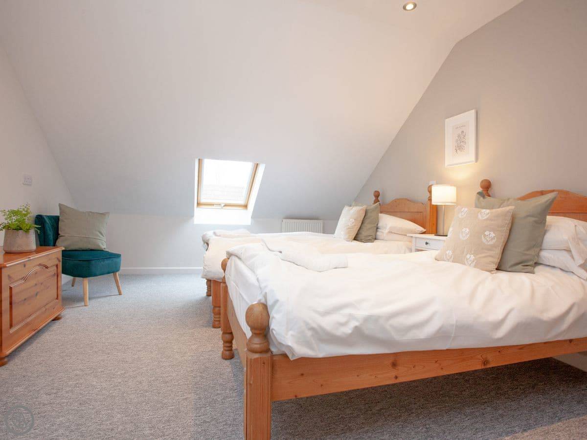 It sleeps six. Three bedrooms, two bathrooms. It's got a 5 Star rating, which means it's well-equipped and very clean. The gardens and views are the main thing here. You're on a 40-acre site with farmland, woods, and two lakes. You'll see deer and hares, and lots of birds like buzzards and owls. The carp in the lower lake are tame enough to feed by hand.