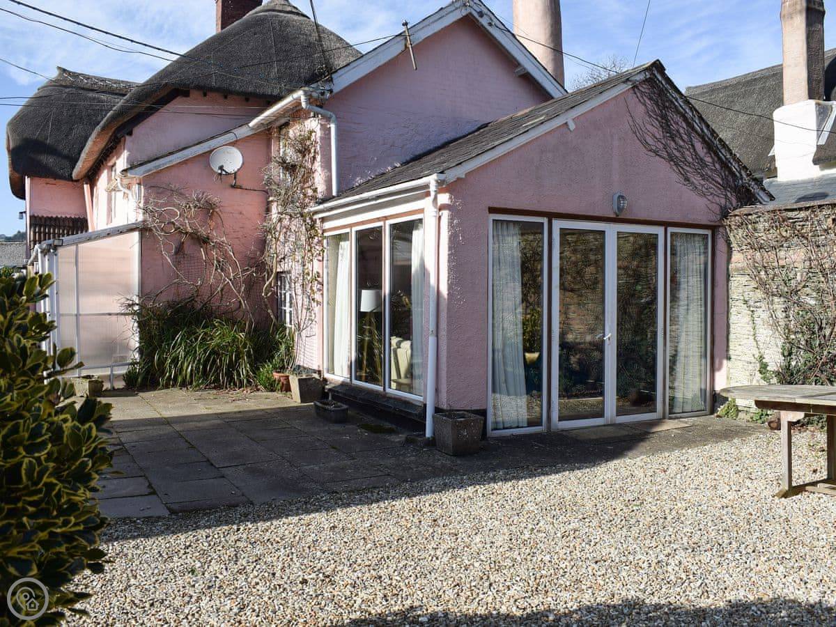 This is Royal Oak Farm. It's the thatched one in the middle of Winsford, detached, so you're on your own. Parts of it are really old, from the 14th century they reckon. It's got five bedrooms and sleeps nine, with three bathrooms, so it's a good size for a group or a family.