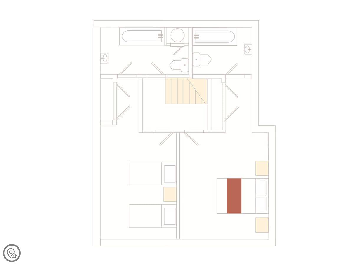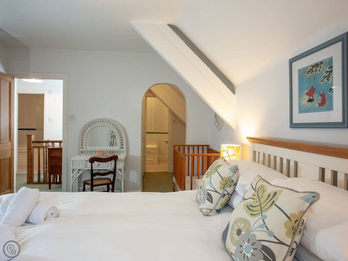 It sleeps four people. There are two bedrooms, and both have their own bathrooms. It's got a 4 Star rating. The main living area is upstairs, which means the views over the creek are better. The stairs are a typical cottage spiral, so they're not wide.