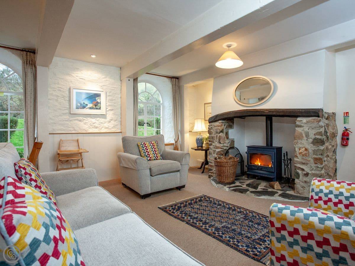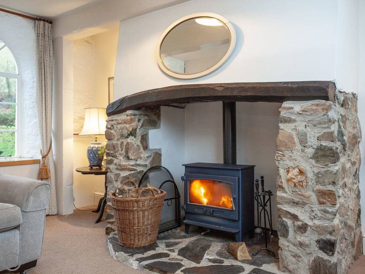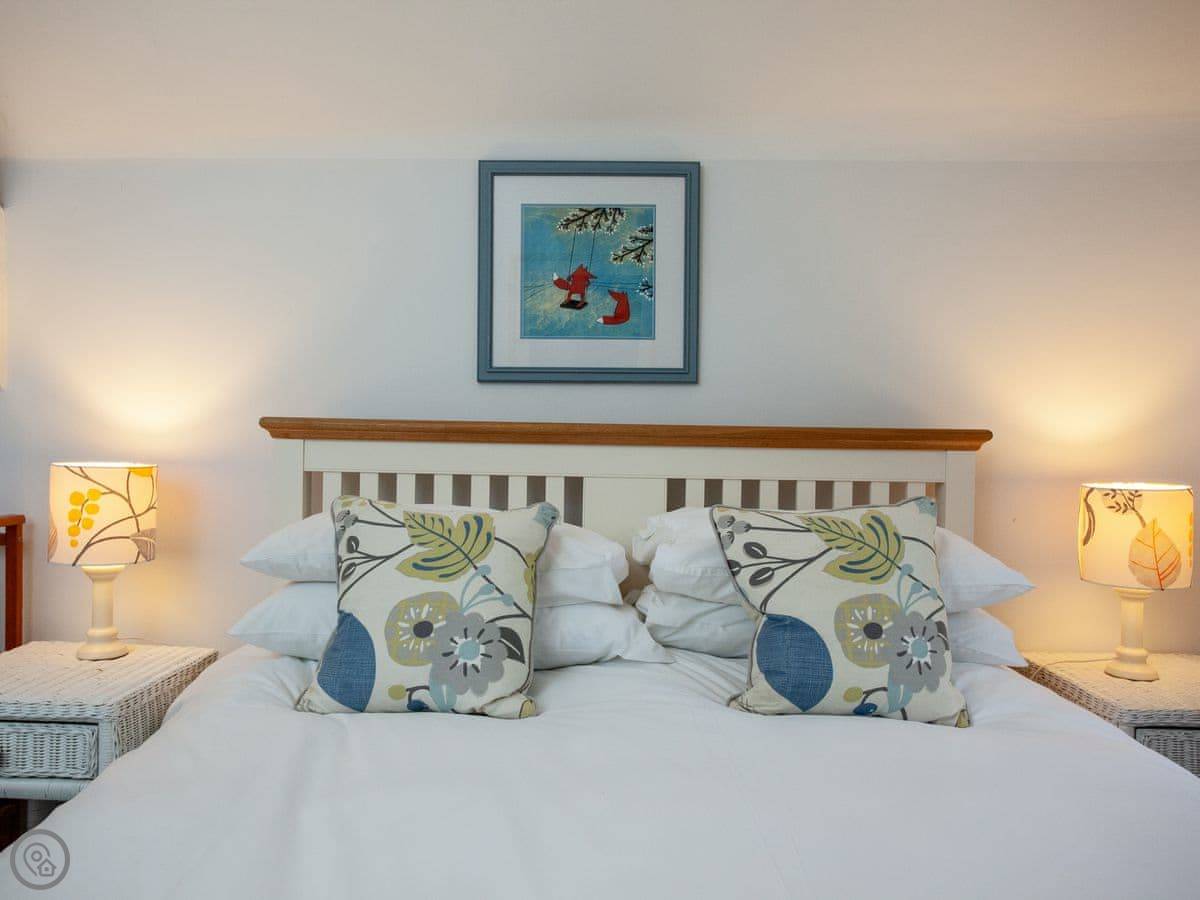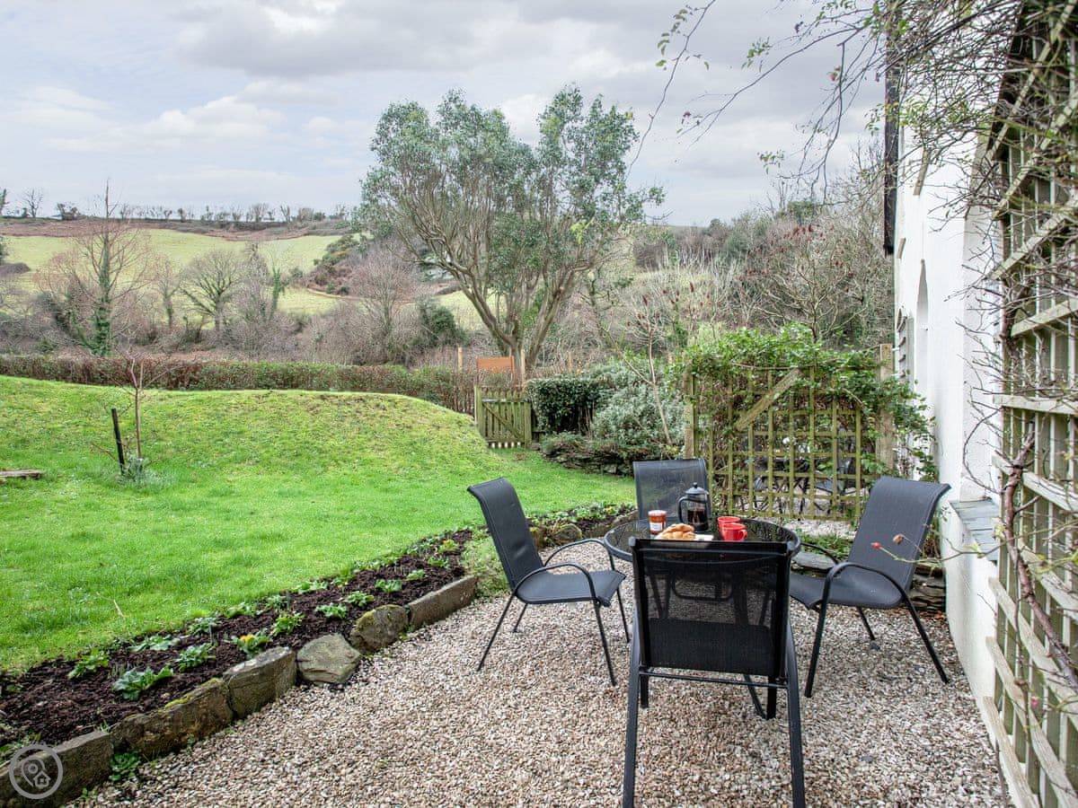 The cottage is good for a couple or a small family. There's a patio with a table and chairs. Bedding is included. You can bring one dog. Inside, you've got a wood burner, a washing machine, and a dishwasher.